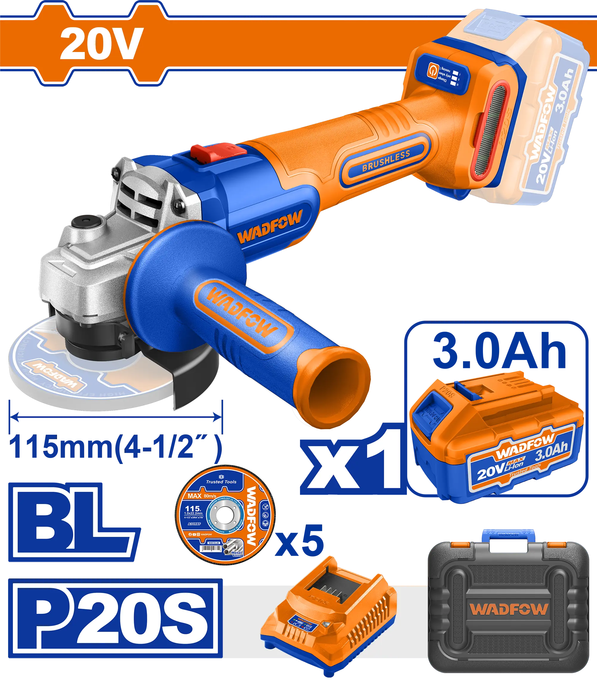 - Producto: AMOLADORA ANGULAR 4 1/2» BL 20V + 1 BAT 3.0AH + CARG WADFOW