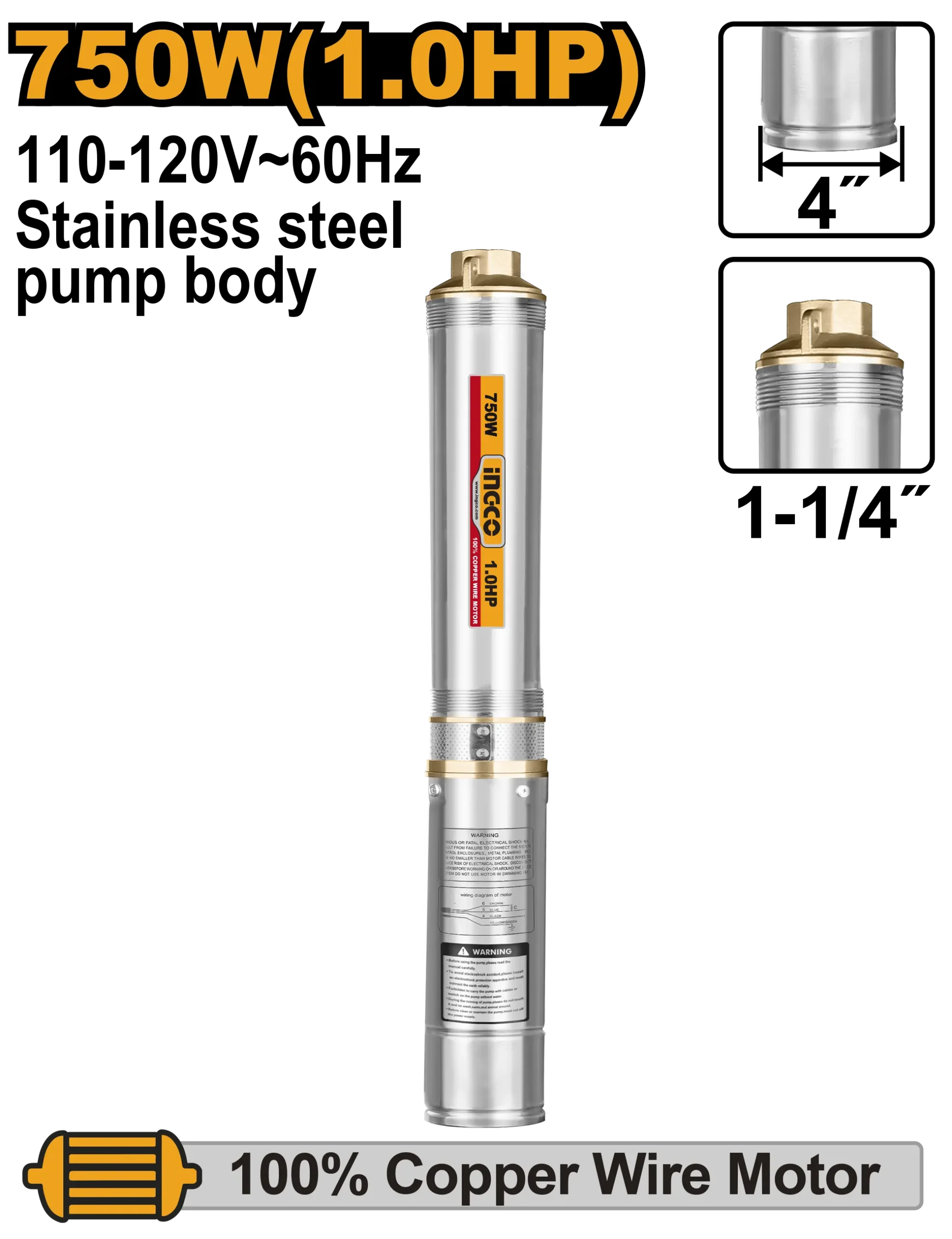 BOMBA DE AGUA SUMERGIBLE 1.0 HP INDUSTRIAL INGCO es un producto dentro de la categoría Herramientas eléctricas. Marca detectada: Ingco. Producto de ferretería con guía de uso basada en su nombre y medidas. Datos detectados: Largo: 82 m; Voltaje: 120 V; Potencia: 750 W; Diámetro: 4″.