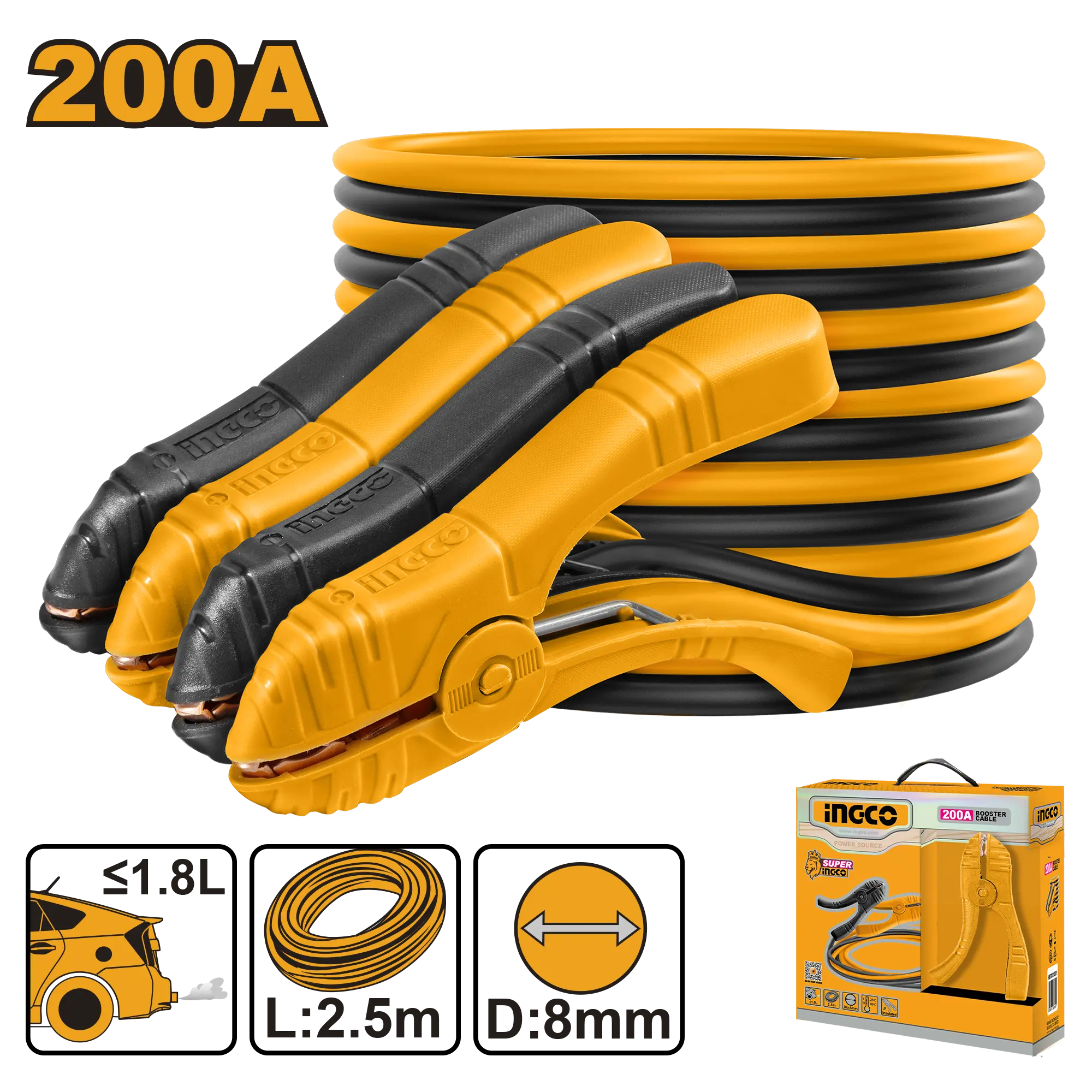 Corriente: 200 AMPtamaño de la abrazadera: 14x9cmMaterial del cable: cobre recubiertoCable de diámetro exterior: 8 mmLa longitud del cable: 2.5 mAdecuado para la emisión del coche ≤1.8L
