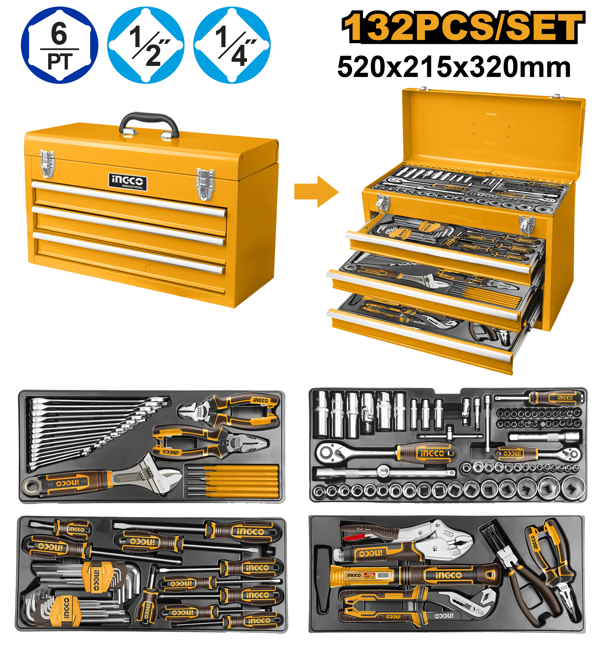 Partes de herramientas: 1 llave de trinquete: 1/4″ 13 dados de 1/4″ 4-4,5-5-5,5-6-7-8-9-10-11-12-13-14 24 puntas de 1/4″ x 32(L) Dado: hexagonal: 3-4-5-6-7-8-10 mm Estrella: T8-T10-T15-T20-T25-T30-T40 SL: 4-5,5-6,5-8 mm, PH1, PH2, PH3, PZ1, PZ2, PZ3. 3 dados profundos de 1/4″ DR 50 mm (L): 8-10-12 mm 2 barras de extensión: 1/4″ Dr. x 50 mm, 1/4″ Dr. x 100 mm 1 pieza Mango giratorio: 1/4 «x 150 mm 1 pieza Junta universal de 1/4 «1 pieza Barra deslizante en «T»: 1/4 «x 114 mm 1 pieza Llave de trinquete: 1/2» 1 pieza Junta universal de 1/2 «18 piezas Dado de 1/2» DR: 10-11-12-13-14-15-16-17-18-19-20-21-22-23-24-27-30-32 mm 3 piezas Dado profundo de 1/2 «DR 77 mm (L): 13-17-19 mm 2 piezas Dado de bujía: 1/2» Dr. 16 mm -21 mm 2 piezas Barra de extensión: 1/2 «Dr. x 125 mm, 1/2″ Dr. x 250 mm 1 adaptador de tres vías de 1/2″: 3/8″ (F) x 1/2 (M) 10 destornilladores: SL3*75, SL4*100, SL5.5*100, SL6.5*38, SL6.5*125, SL8*150, PH0*75, PH1*100, PH2*38, PH2*150, 14 llaves combinadas: 6-7-8-9-10-11-12-13-14-15-16-17-18-19 9 llaves hexagonales: 1,5-2-2,5-3-4-5-6-8-10 9 llaves Trox: T10-T15-T20-T25-T27-T30-T40-T45-T50 1 llave de bloqueo de mordaza curva de 10″ 1 alicate para bomba de agua de 10″ 1 alicate de punta larga de alto apalancamiento de 6″ 1 alicate combinado de alto apalancamiento de 7″ 1 alicate de corte diagonal de alto apalancamiento de 6″ 2 alicates de anillo de retención 1 martillo de maquinista de 300 g 1 llave ajustable de 10» 6 punzones: 1,5 x 152 mm 3 x 152 mm 4 x 152 mm 5 x 152 6 x 152 mm 8 x 152 mm