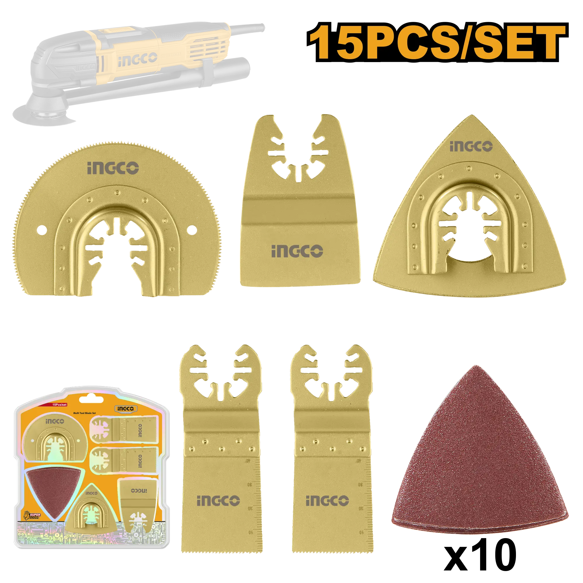 10 piezas de papel de lija delta de óxido de aluminio para madera. tamaño: 80 mm (3-1 / 8 «») Hoja de sierra radial para madera al ras CRV de 1 pieza. tamaño: 34 mm (1-5 / 16 «») Hoja de sierra de metal al ras estándar bimetálica de 1 pieza. tamaño: 34 mm (1-5 / 16 «») 1 pieza de rascador rígido. tamaño: 50 mm (2 «»)