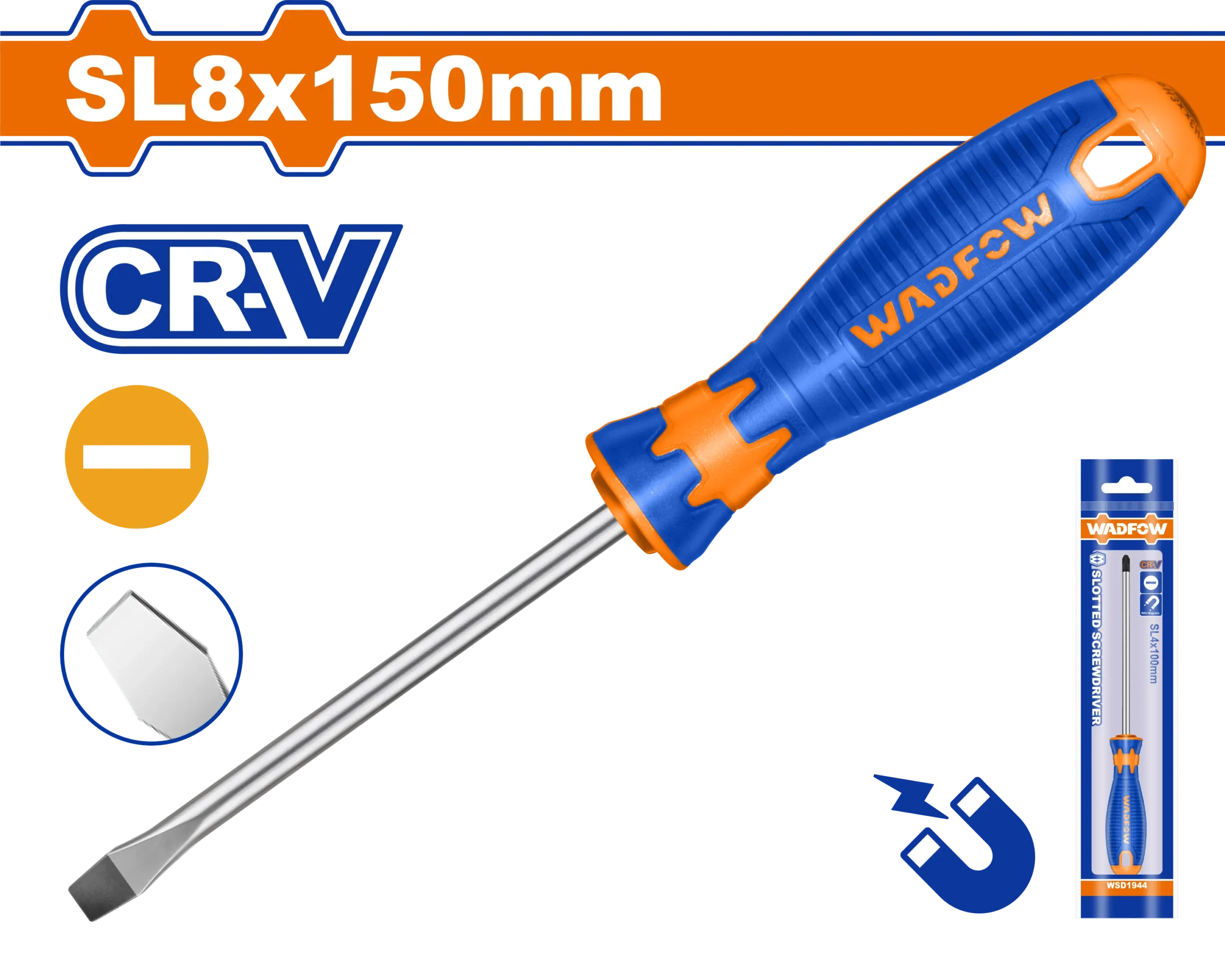- ¿Para quién es ideal? Para quienes necesitan destornillador plano en mantenimiento, montaje o reparaciones diarias. DESTORNILLADOR PLANO 5/16″ X 6″ BICOLOR FUNDA WADFOW aporta control y orden al trabajo.