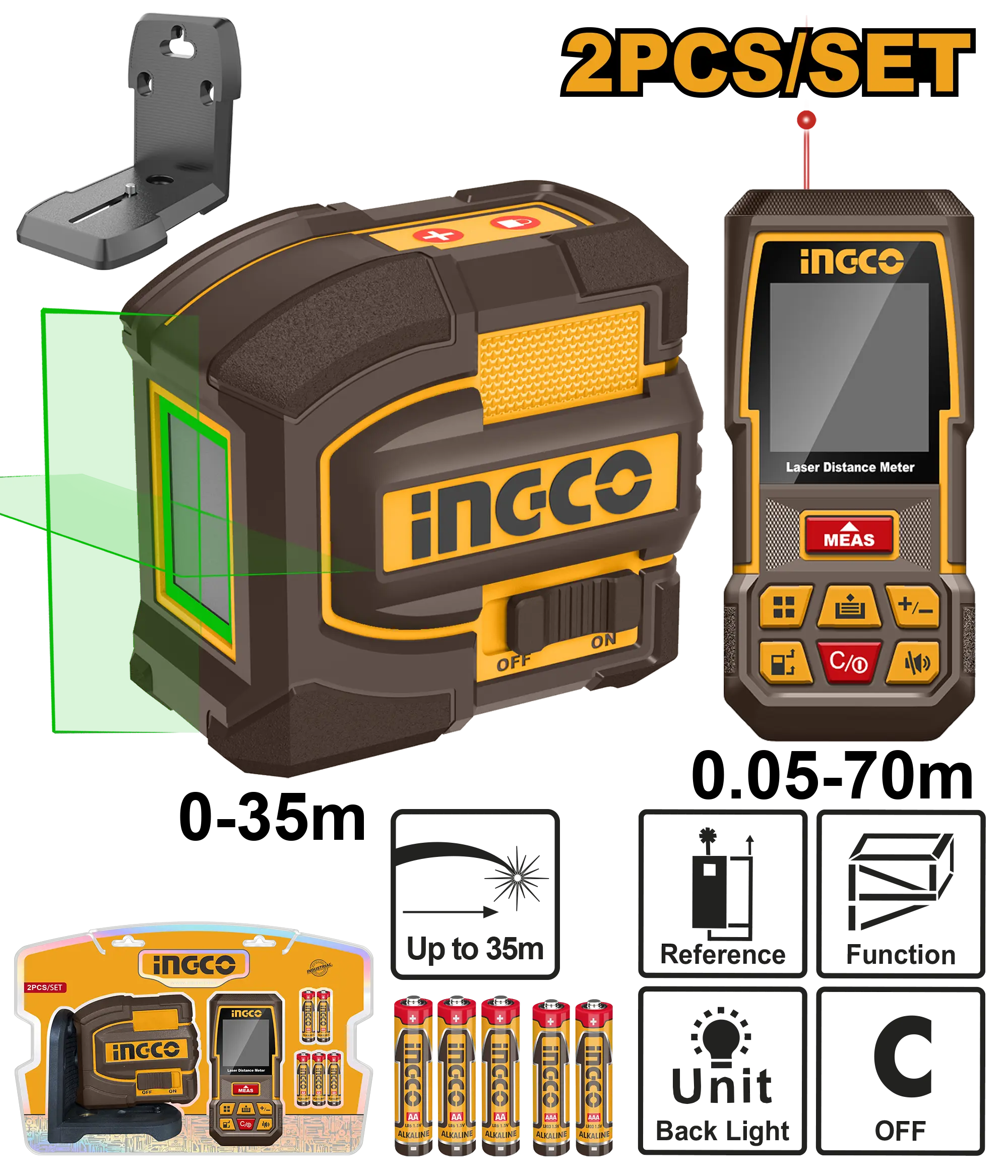 JUEGO COMBINADO DE 2 PIEZAS LASER DE LINEA AUTONIVELANTE LUZ VERDE 2 LINEAS 35M + MEDIDOR DE DISTANCIA LASER 70M INGCO es un producto dentro de la categoría Herramientas de medición. Marca detectada: Ingco. Producto de ferretería con guía de uso basada en su nombre y medidas. Datos detectados: Medida: 5 mm; Largo: 35 m; Voltaje: 5 V; Color: Verde.