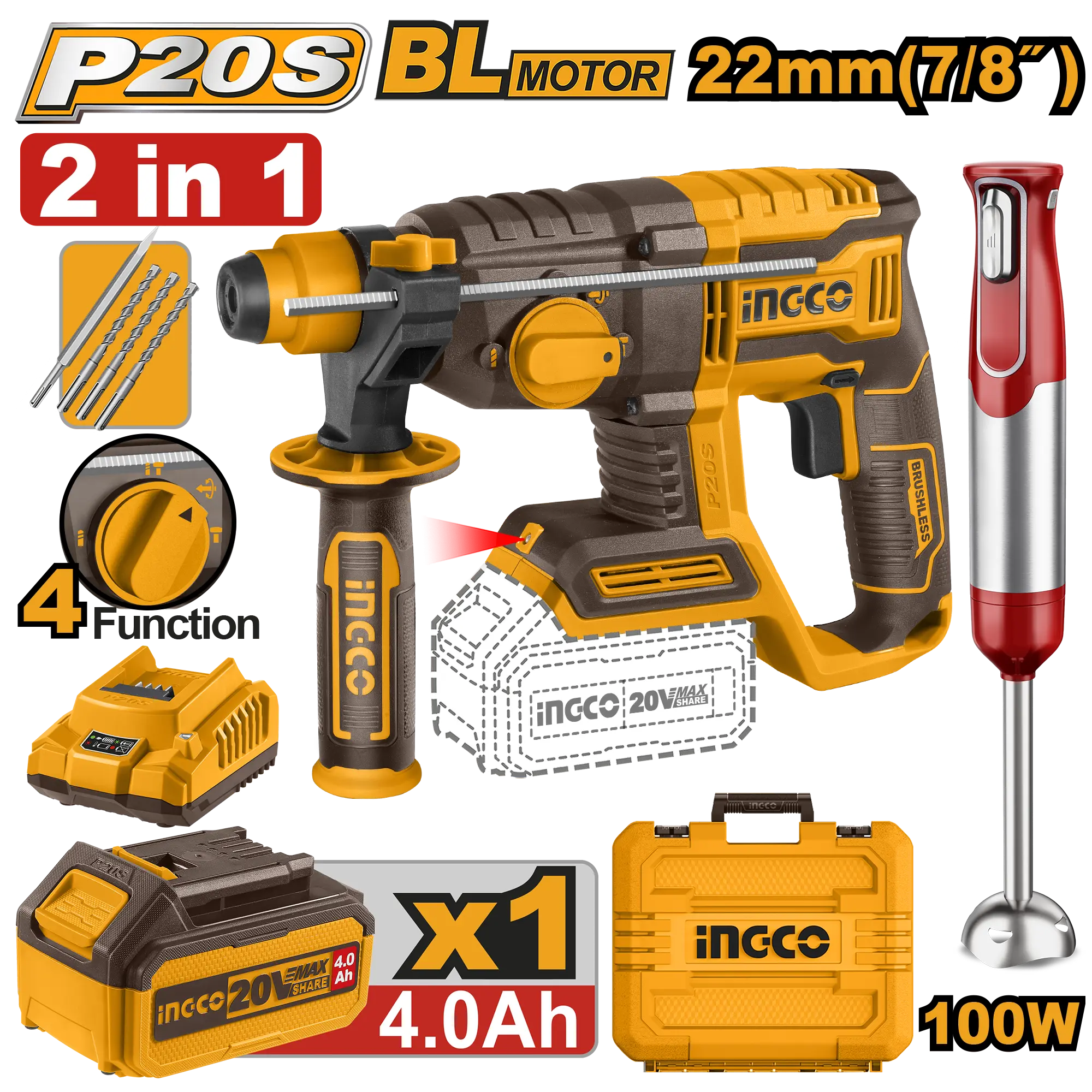 • Batidora de mano inalámbrica (CHB023H): Potencia: 100 W Voltaje: CC 11,1 V Volumen de la batería: 2000 mAh Varilla de mezcla de eje SUS de 2 velocidades y velocidad variable continua Incluye: Brocas de 3 piezas (6,8,10 mm) 1 pieza cincel 1 batería de 4,0 Ah (FBLI20021) 1 carga (UFCLI2001) Voltios de carga: 110-120 V ~ 50/60 Hz