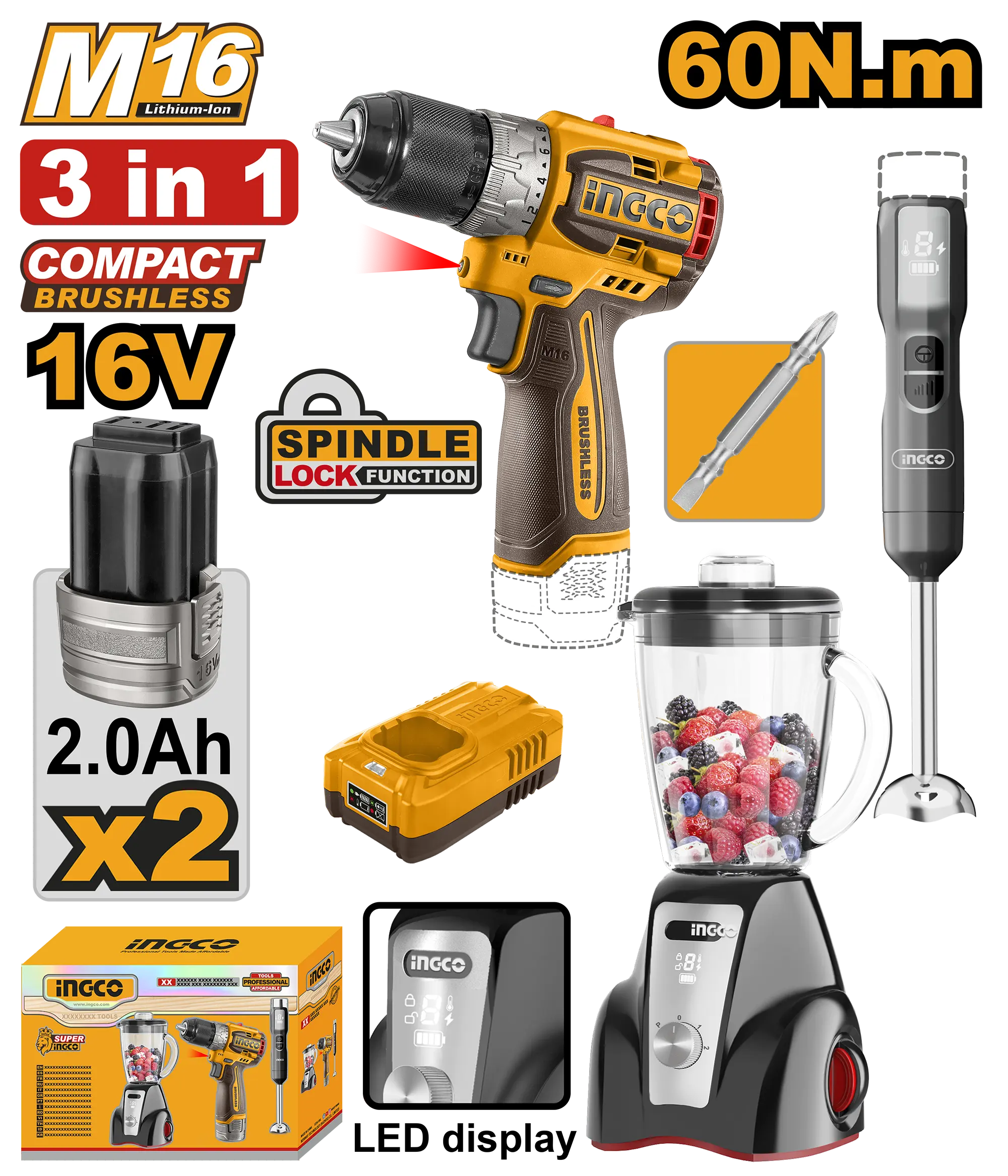 Incluye: 1 pieza de broca Cr-V de 65 mm 1 pieza de jarra de vidrio 2 piezas de paquete de batería de 2.0Ah 16V (FBLI1620) 1 pieza de cargador (UFCLI1613) Cargar Voltios: 110-120 V ~ 50-60 Hz