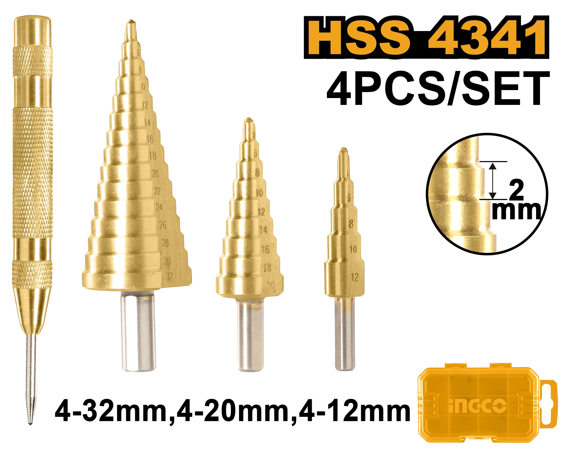Broca escalonada de 3 piezas con punzón central automático de 1 pieza 1 pieza de 4-12 mm. 2 mm/paso 1 pieza de 4-20 mm. 2 mm/paso 1 pieza de 4-32 mm. 2 mm/paso