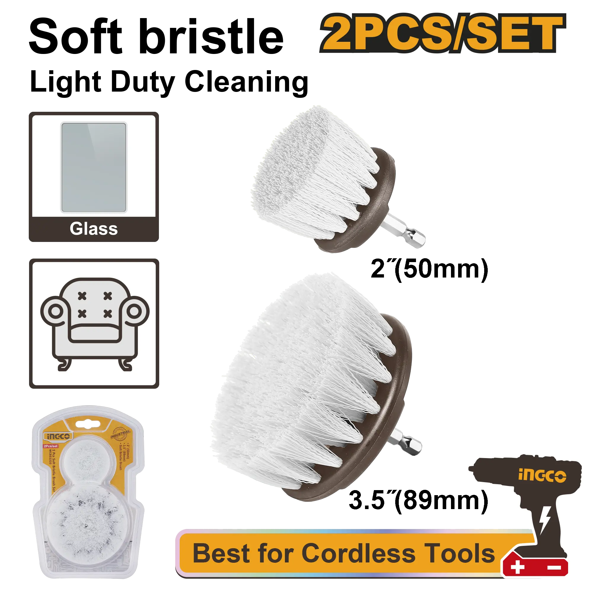 Incluye: 1 cepillo de cerdas suaves de 2″. 1 cepillo de cerdas suaves de 3.5″ Cerdas suaves para revestimientos. vidrio y otras aplicaciones de limpieza ligeras. Cerdas de nailon duraderas para una mayor vida útil del cepillo. Embalado en doble blister