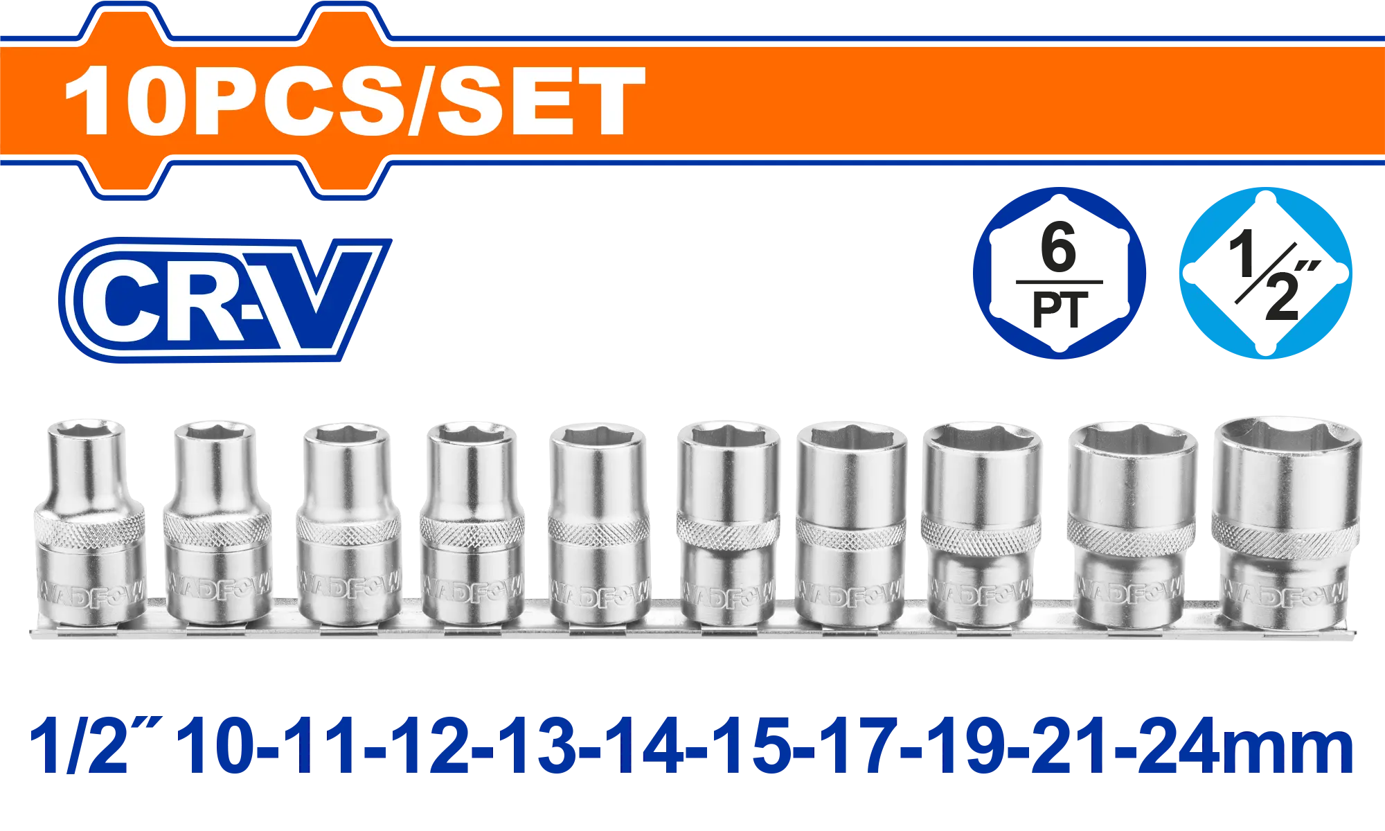 Incluye: 10 vasos de 1/2″: 10, 11, 12, 13, 14, 15, 17, 19, 21, 24 mm