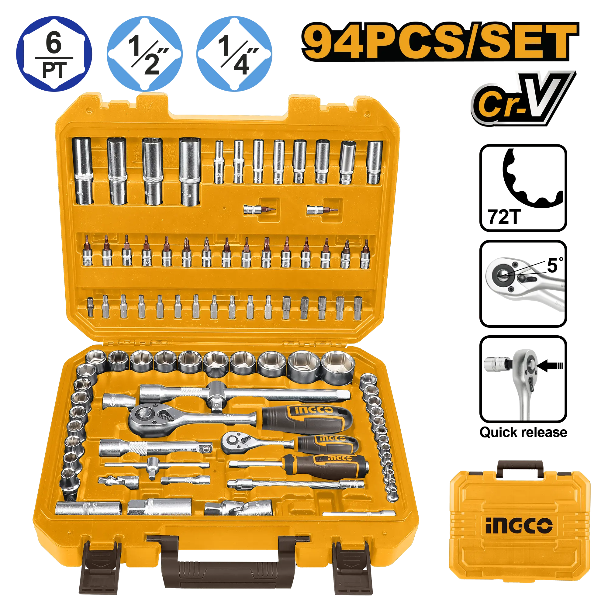 El juego de 94 piezas de dados de 1/4″+1/2″ incluye: