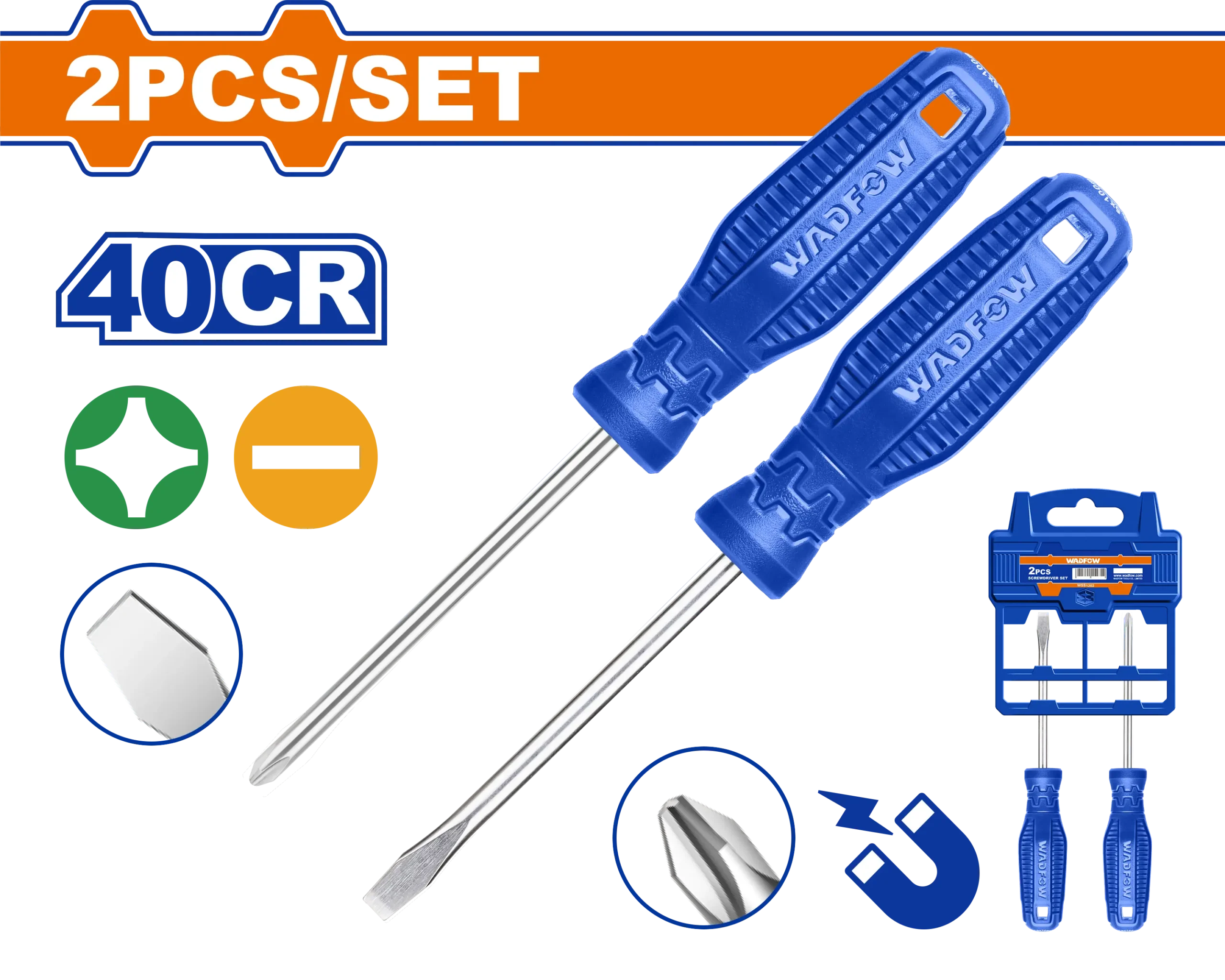 - ¿Para quién es ideal? Para quienes necesitan destornillador en mantenimiento, montaje o reparaciones diarias. JUEGO DE DESTORNILLADORES DE 2 PIEZAS 1/4″ X 4 ESTRE+PLA BLIS AZUL WADFOW aporta control y orden al trabajo.