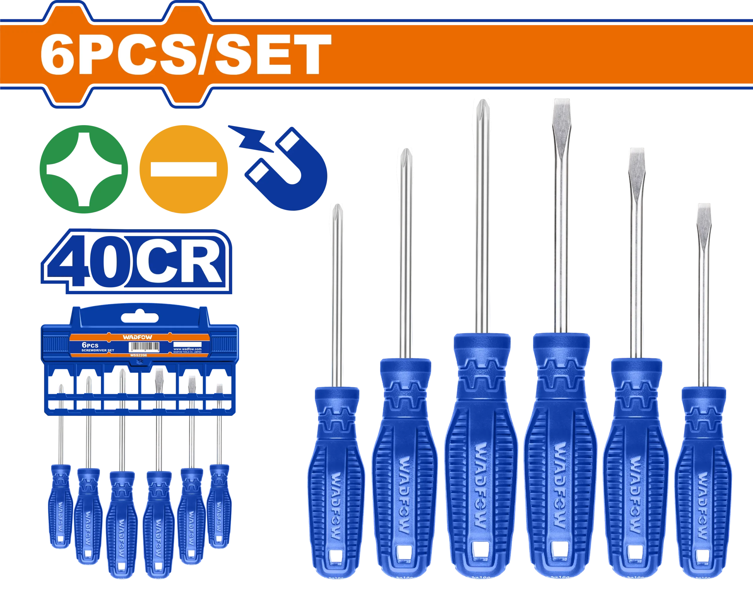 - ¿Para quién es ideal? Para quienes necesitan destornillador en mantenimiento, montaje o reparaciones diarias. JUEGO DE DESTORNILLADORES DE 6 PIEZAS WADFOW aporta control y orden al trabajo.