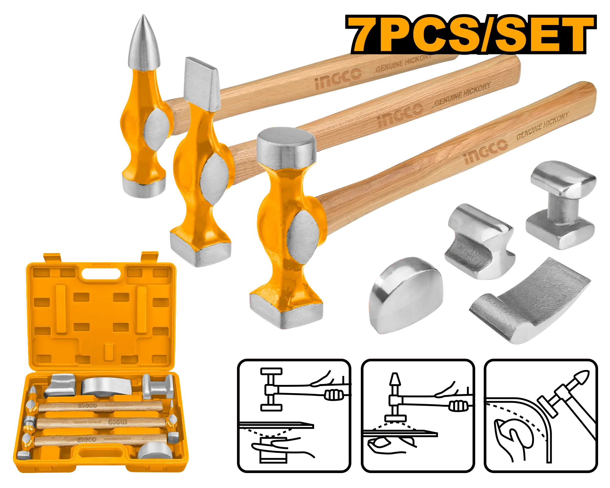 Juego de martillos para cuerpo y guardabarros de 7 piezas, mango de nogal genuino 1 martillo con extremo de cincel, 1 martillo de selección, 1 martillo de golpe, 1 plataforma rodante de encogimiento, 1 plataforma rodante de doble extremo, 1 plataforma rodante curva, 1 plataforma rodante de talón, cabezal de martillo forjado, tratamiento térmico, acero al carbono 45#,