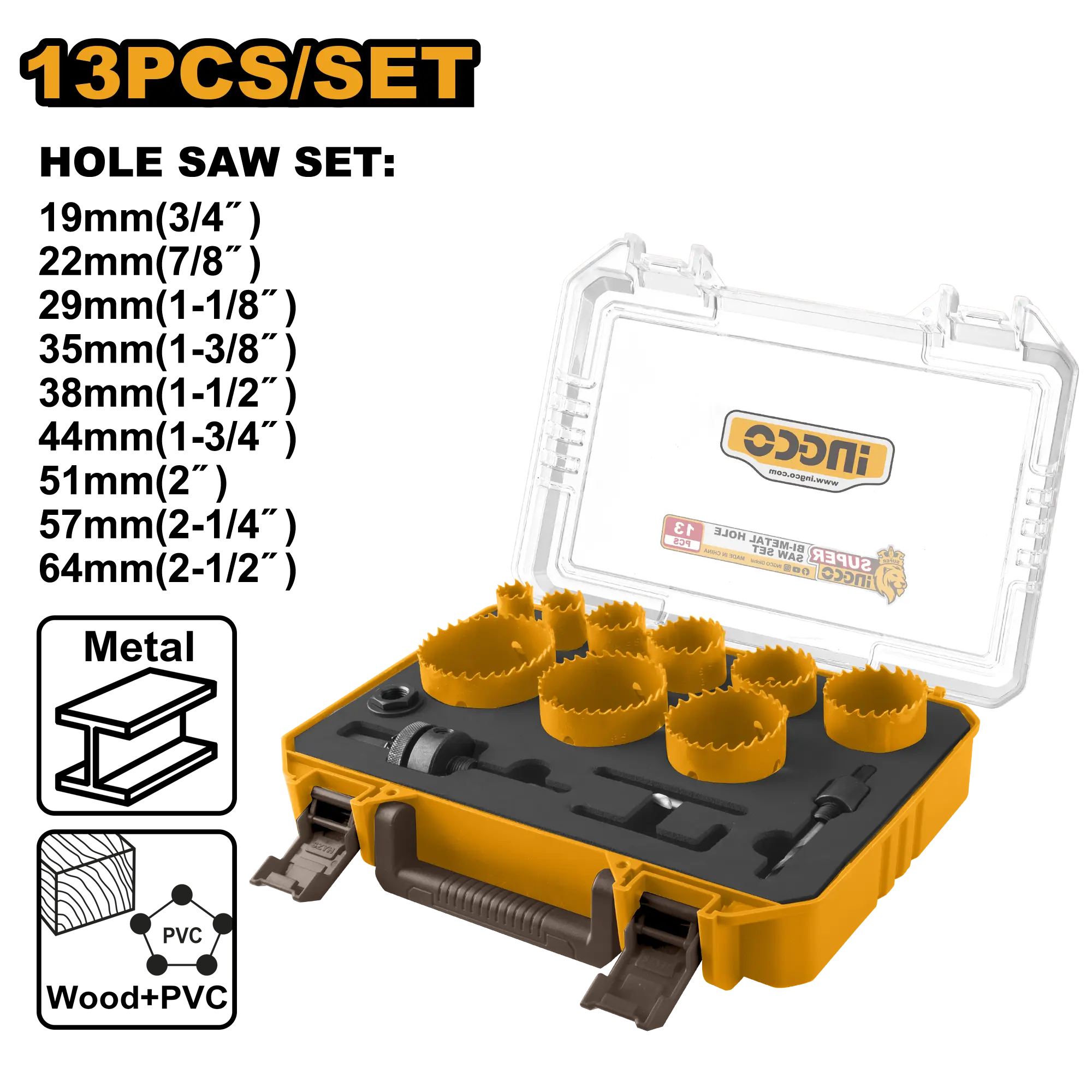 Tamaño: 19 mm (3/4″)/22 mm (7/8″)/29 mm (1-1/8″)/35 mm (1-3/8″)/38 mm (1-1/2″)/44 mm (1-3/4″)/51 mm (2″)/57 mm (2-1/4″)/64 mm (2-1/2″) 1 mandril: vástago hexagonal de 3/8″. tamaño de ajuste: 9/16″ ~ 1-3/16″ 1 mandril: vástago hexagonal de 7/16″. tamaño de ajuste: 1-1/4″ ~ 8-17/64″ 1 mandril adaptador con roscas de 1/2-20 para adaptarse a sierras de corona de roscas de 5/8-18 1 broca piloto 1 llave hexagonal
