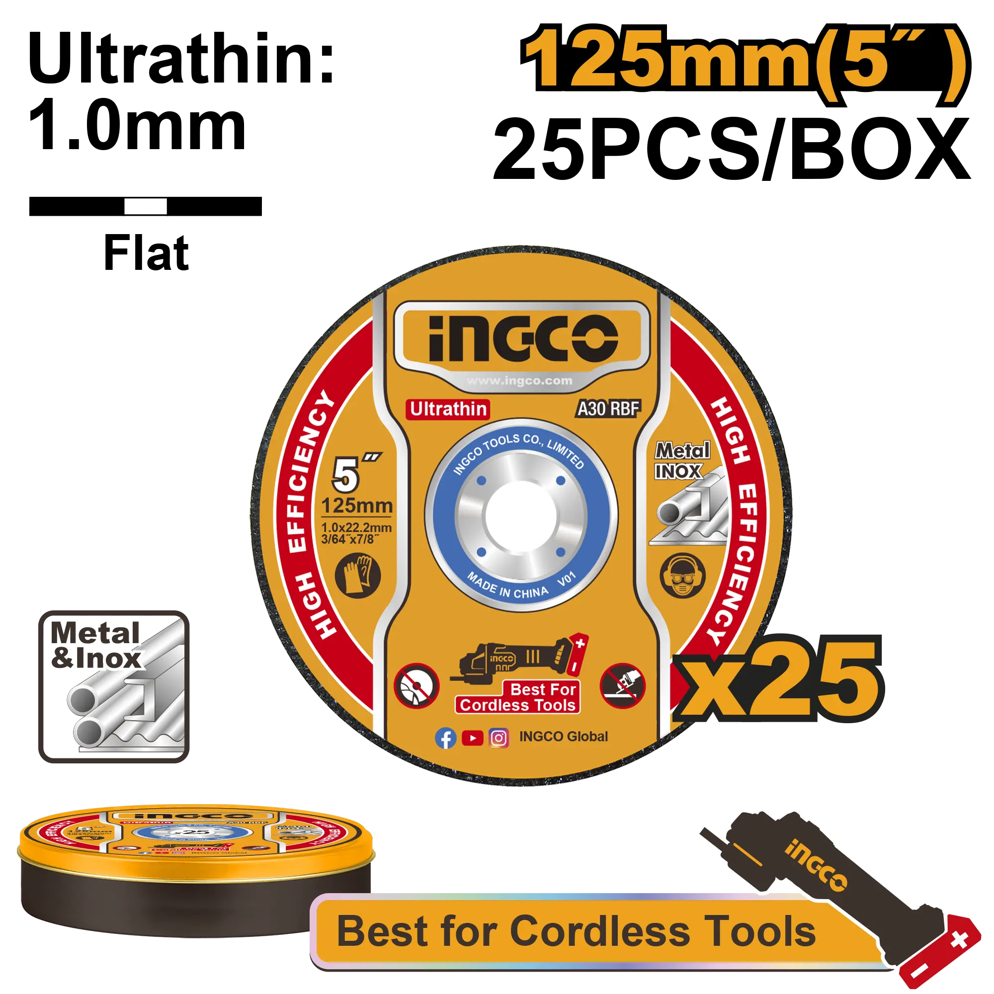 25 piezas/juego Tamaño: 125 mm (5 «) x 1.0 mm (3/64 «) x 22.2 mm (7/8») Centro plano Disco de corte para metal e inox RPM: 12200r/min Embalado por caja de metal
