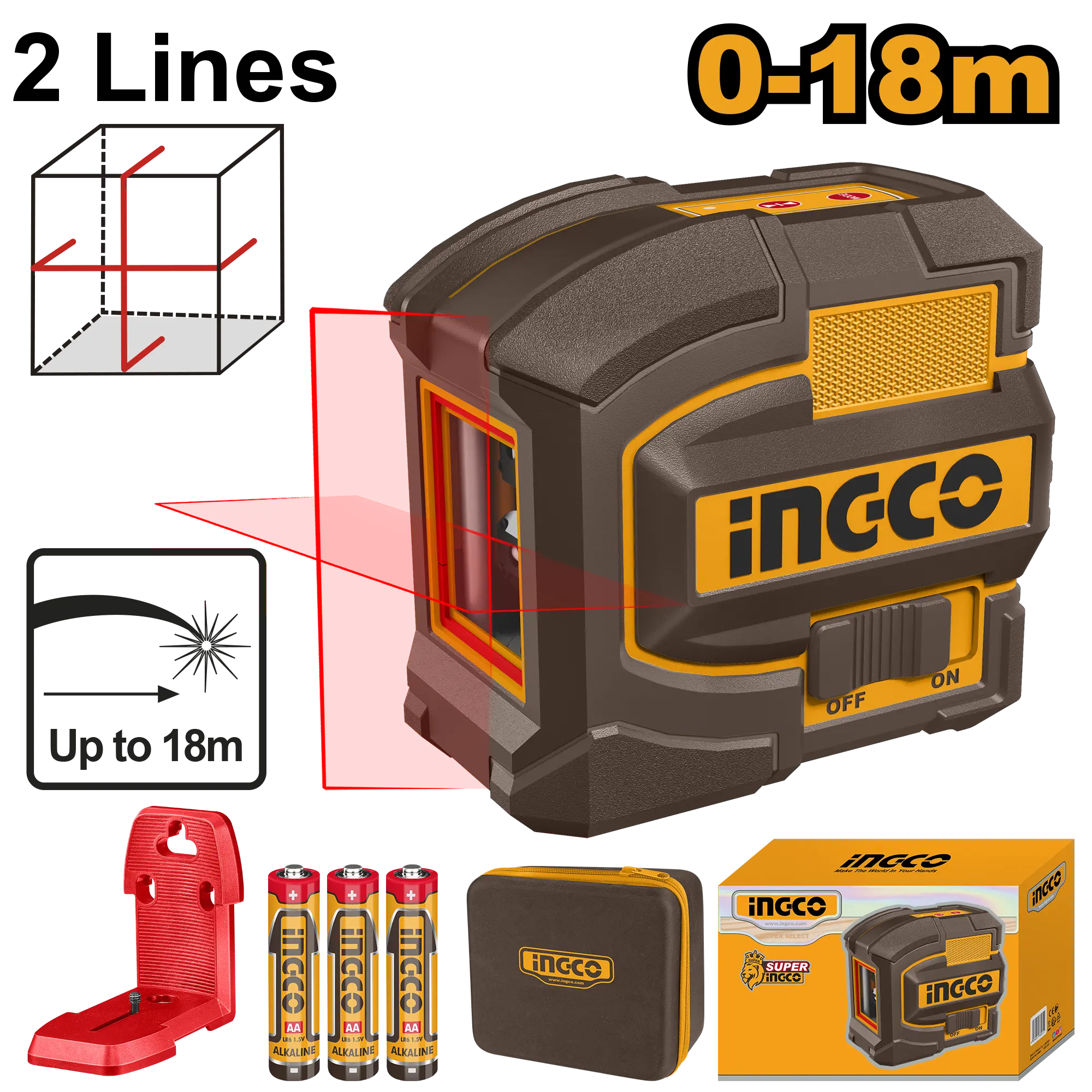 LASER DE LINEA AUTONIVELANTE LUZ ROJA 2 LINEAS 18M INGCO es un producto dentro de la categoría Herramientas de medición. Marca detectada: Ingco. Producto de ferretería con guía de uso basada en su nombre y medidas. Datos detectados: Medida: 5 mm; Largo: 18 m; Voltaje: 5 V; Color: Roja.