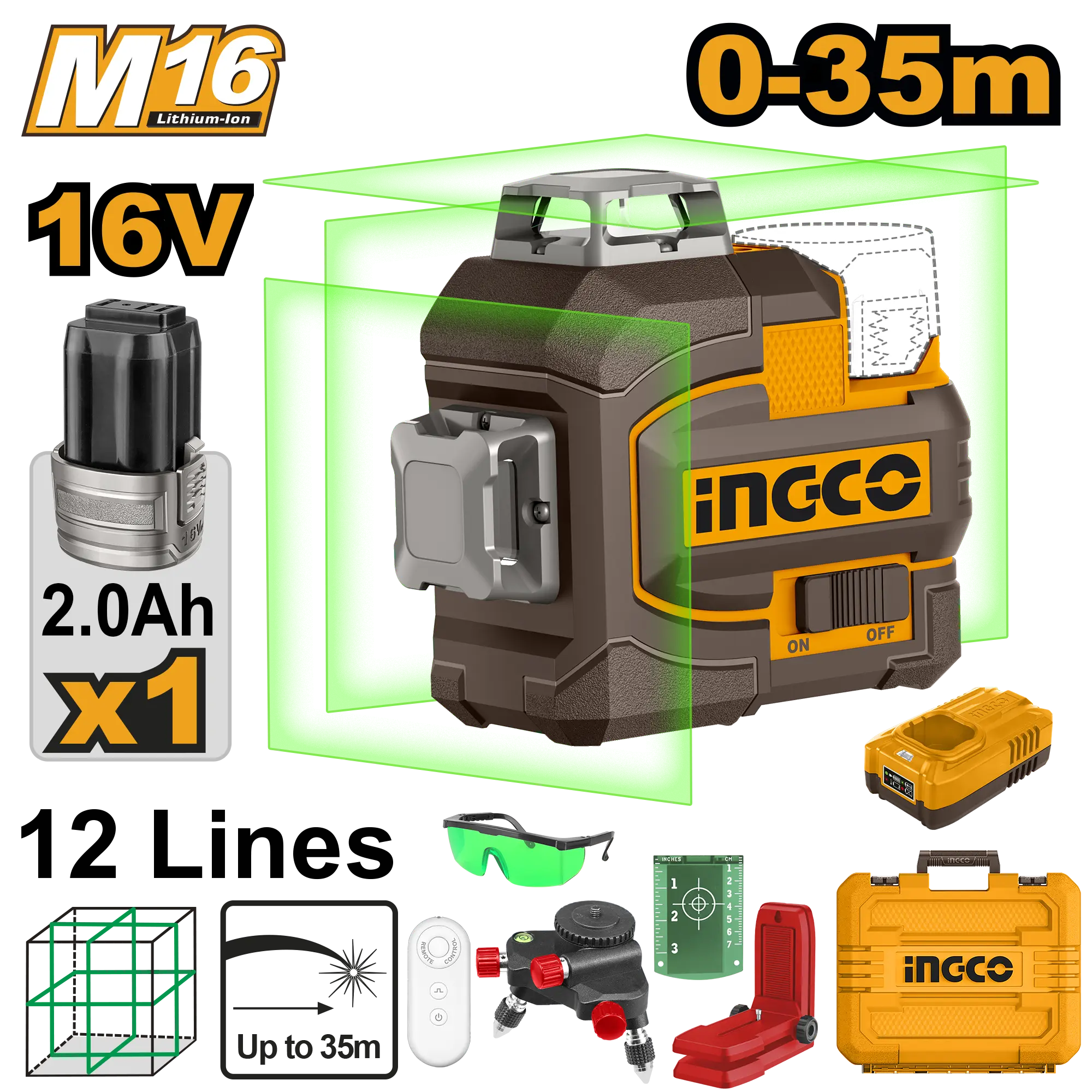 LASER DE LINEA AUTONIVELANTE LUZ VERDE 12 LINEAS 35M 16V + 1 BAT 2.0AH + CARGADOR + MALETA INGCO es un producto dentro de la categoría Herramientas de medición. Marca detectada: Ingco. Producto de ferretería con guía de uso basada en su nombre y medidas. Datos detectados: Largo: 35 m; Voltaje: 16 V; Batería: 2.0 Ah; Color: Verde.
