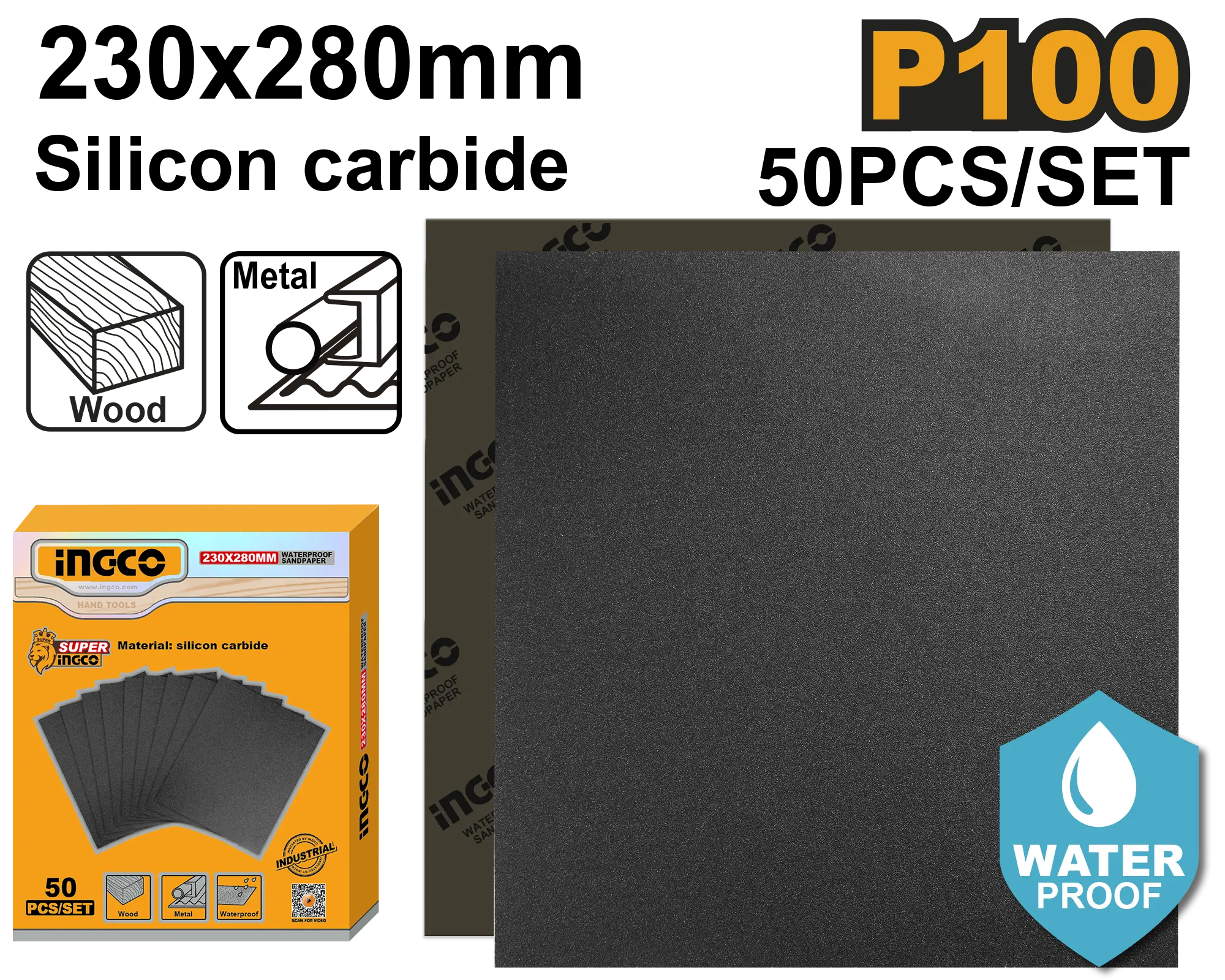 Tamaño: 230×280 mm 50 unidades/juego Grano: P100 Material: carburo de silicio Resistente al agua Combina con la mayoría de las lijadoras manuales. Adecuado para lijar madera, paredes, pintura, plástico, piedra, metal y vidrio. Embalado en caja de color.