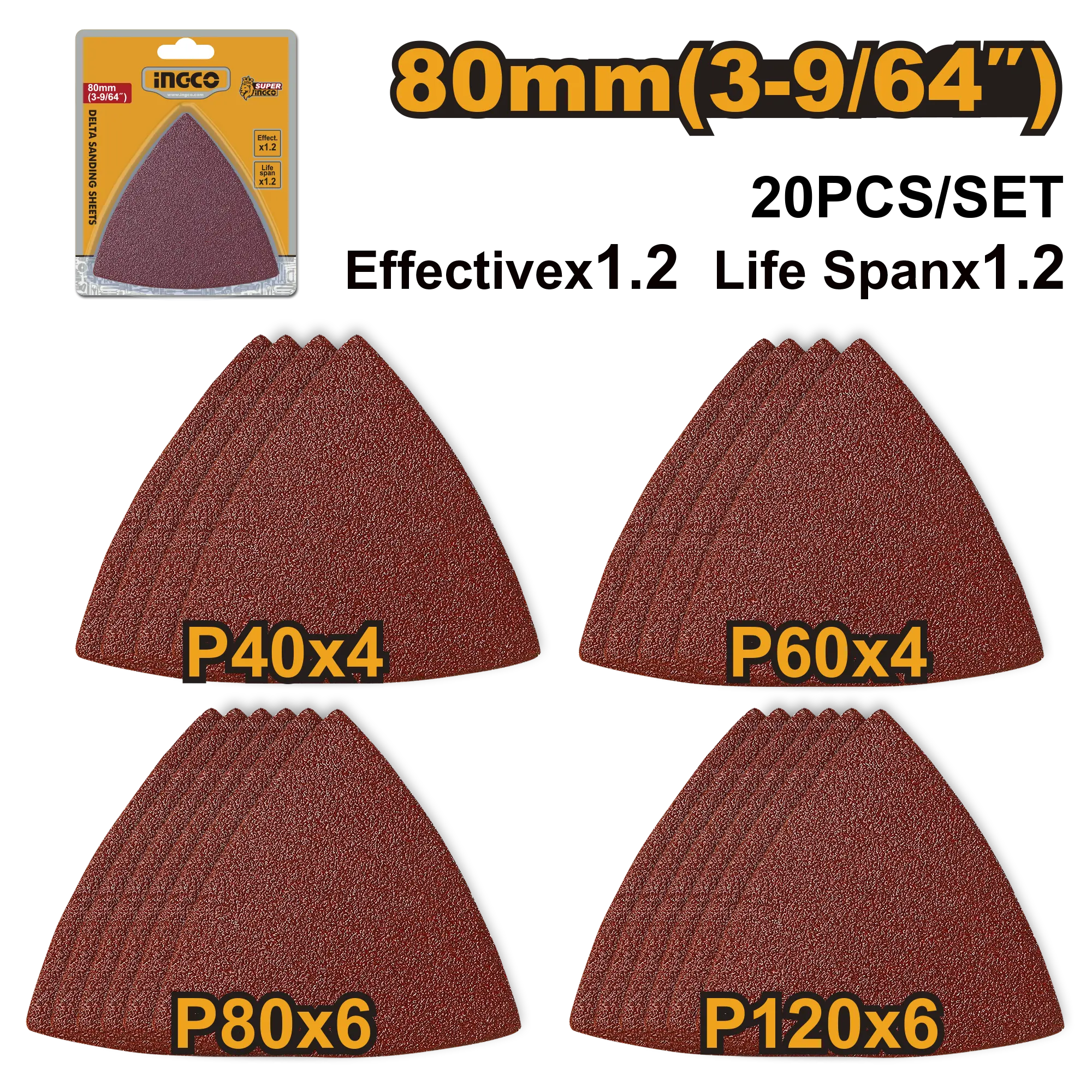 80mm delta P40x4 P60x4 P80x6 P120x6 Óxido de aluminio 20 unids/set Combina con CMLI2001 y MF3008 20% más efectivo que la arena roja normal. Embalado en blíster.