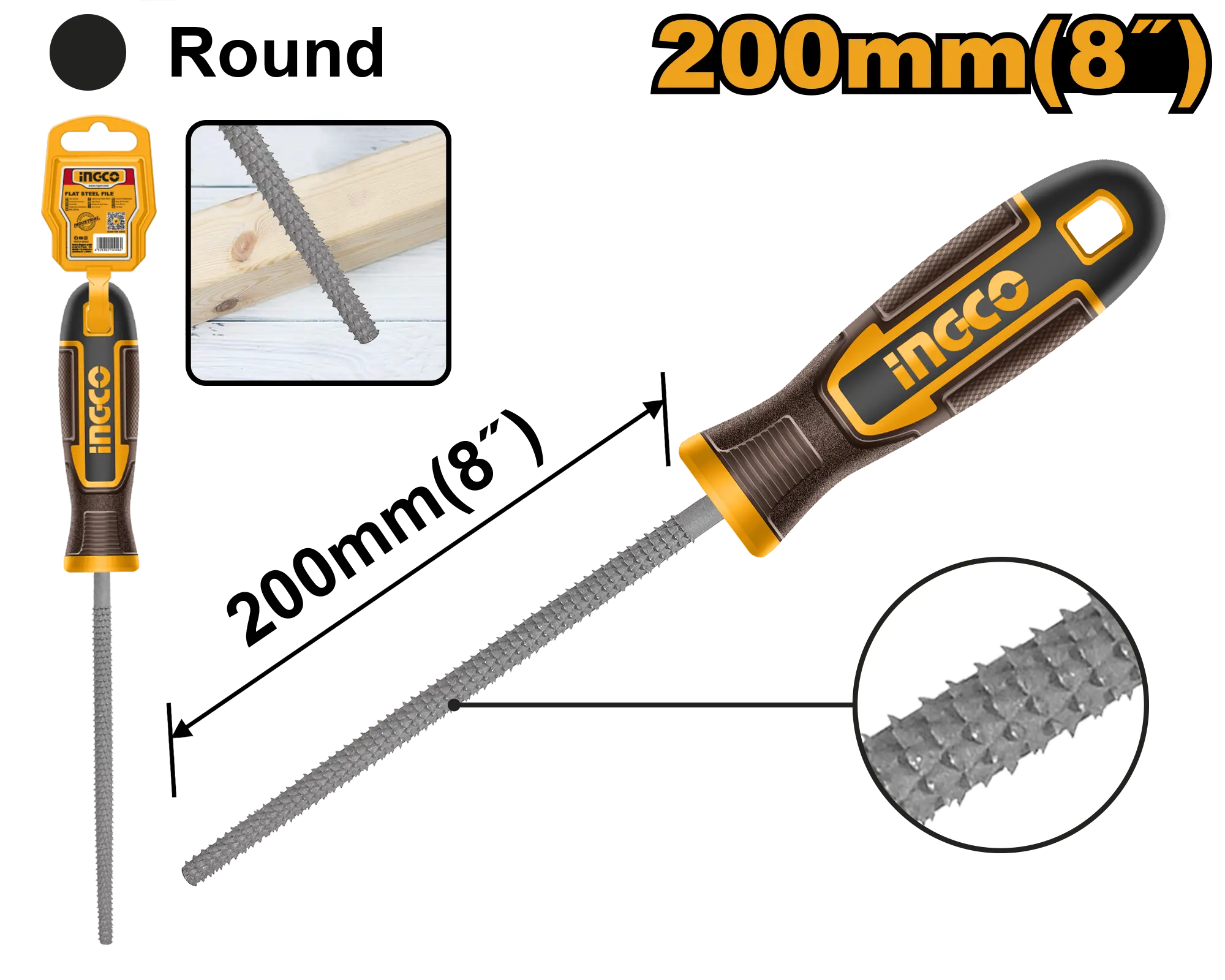 LIMA MADERA REDONDA 8″ INGCO es un producto dentro de la categoría Herramientas manuales. Marca detectada: Ingco. Producto orientado a uso práctico según su nombre y datos detectables, con foco en compatibilidad. Datos detectados: Diámetro: 8″; Medida: 200 mm. Nota: Longitud: acero T12 de 200 mm Embalado en bolsa de polietileno nan.