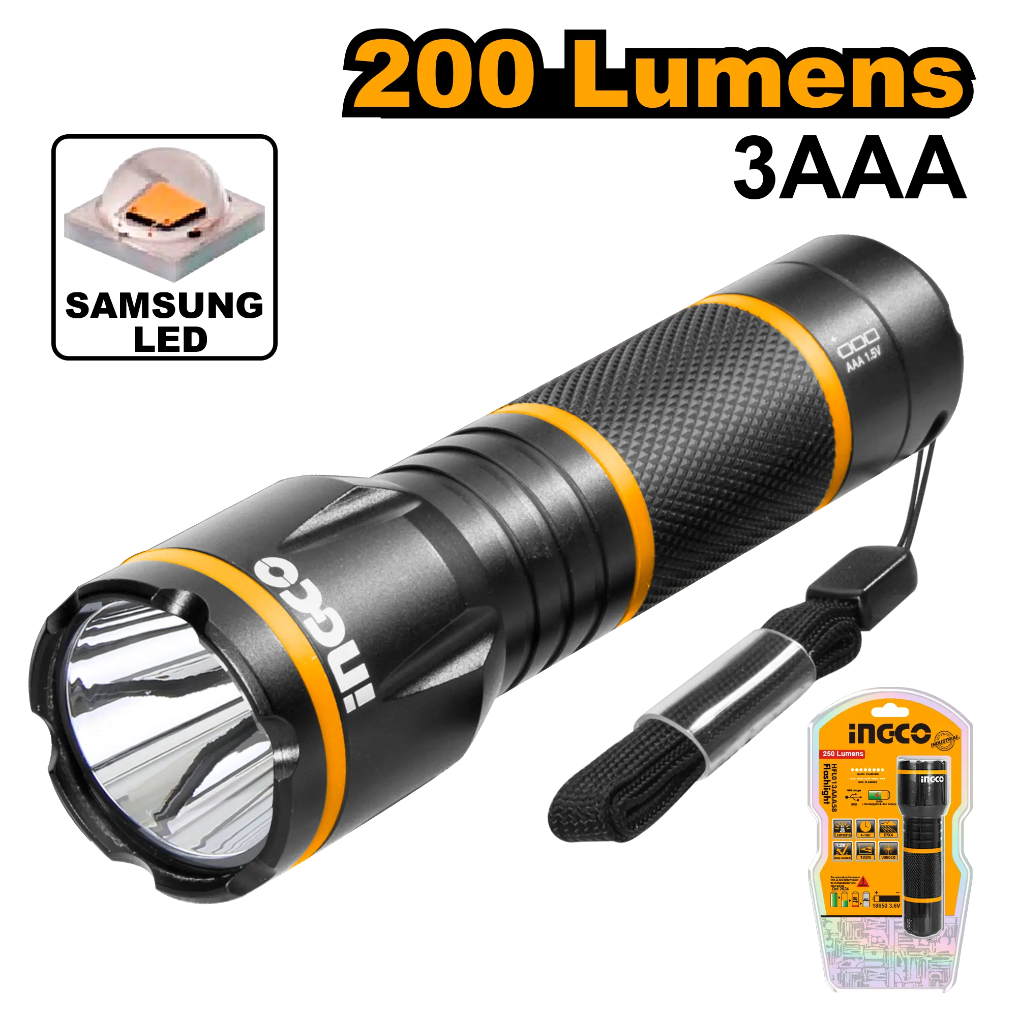 Brillo: 250 lm Distancia de irradiación: 160 m Utilice 3 pilas AAA Interruptor de luz trasera Diámetro/longitud: 34 mm/136 mm Peso: 104 g (sin batería) Embalado en doble blister
