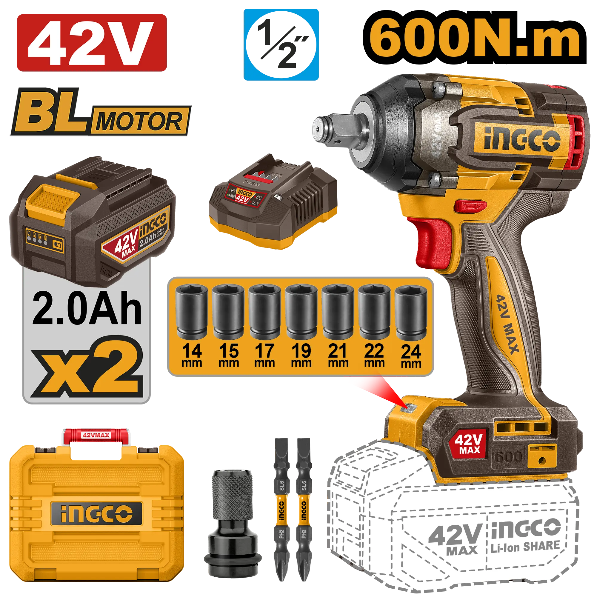 Incluye: 1 clip para cinturón, 7 vasos (14, 15, 17, 19, 21, 22 y 24 mm), 1 destornillador cuadrado de 1/2″ a hexagonal de 1/4″, 2 puntas de destornillador, 2 baterías (FBLI42201), 1 cargador (UFCLI42021).
