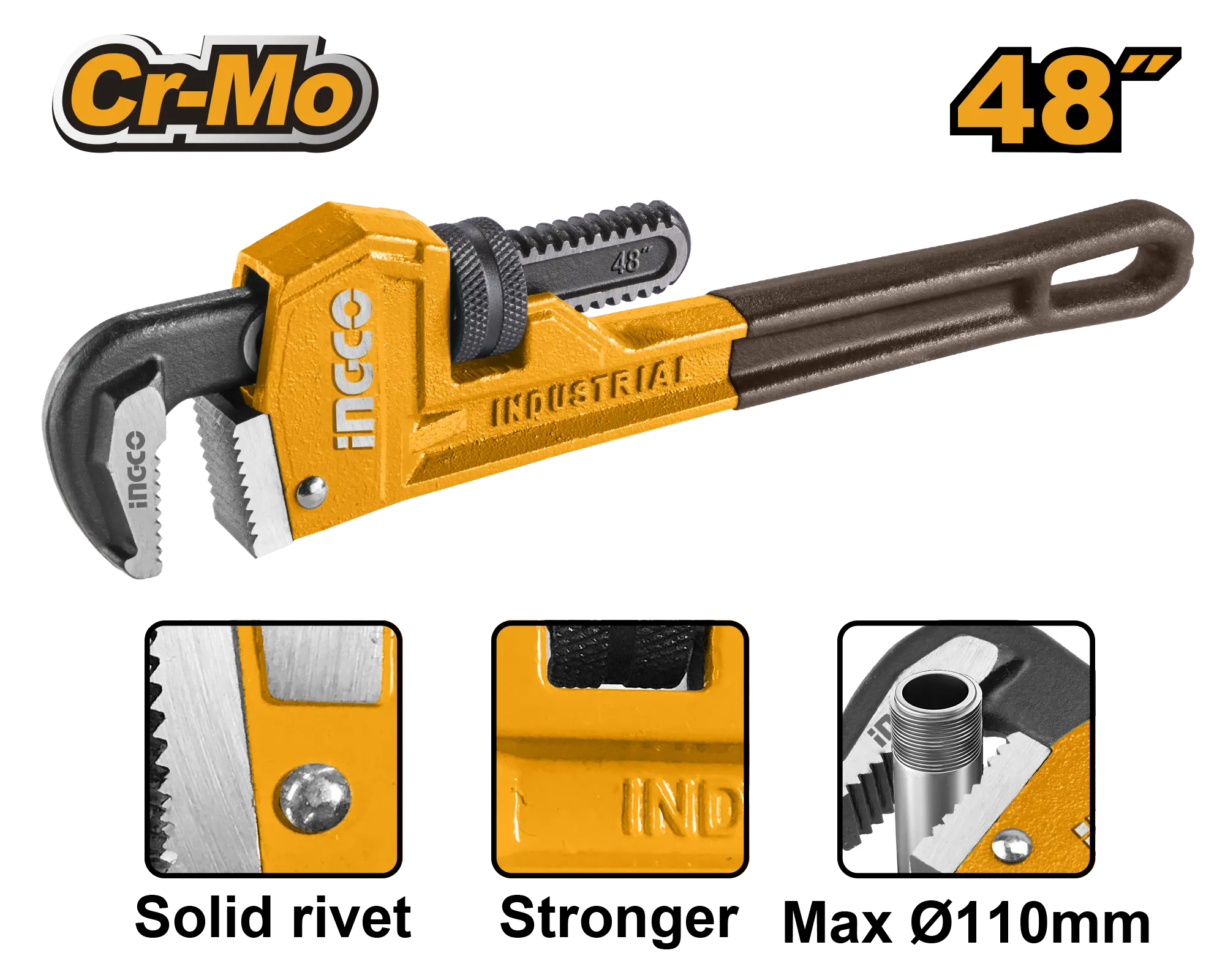 Tamaño: 48″ Diámetro máximo de sujeción: 110 mm Mordaza móvil forjada con acero al carbono de alta calidad Tratamiento inactivado Material del cuerpo: fundición dúctil Acabado negro y pulido Remache macizo Embalado en tarjeta de papel