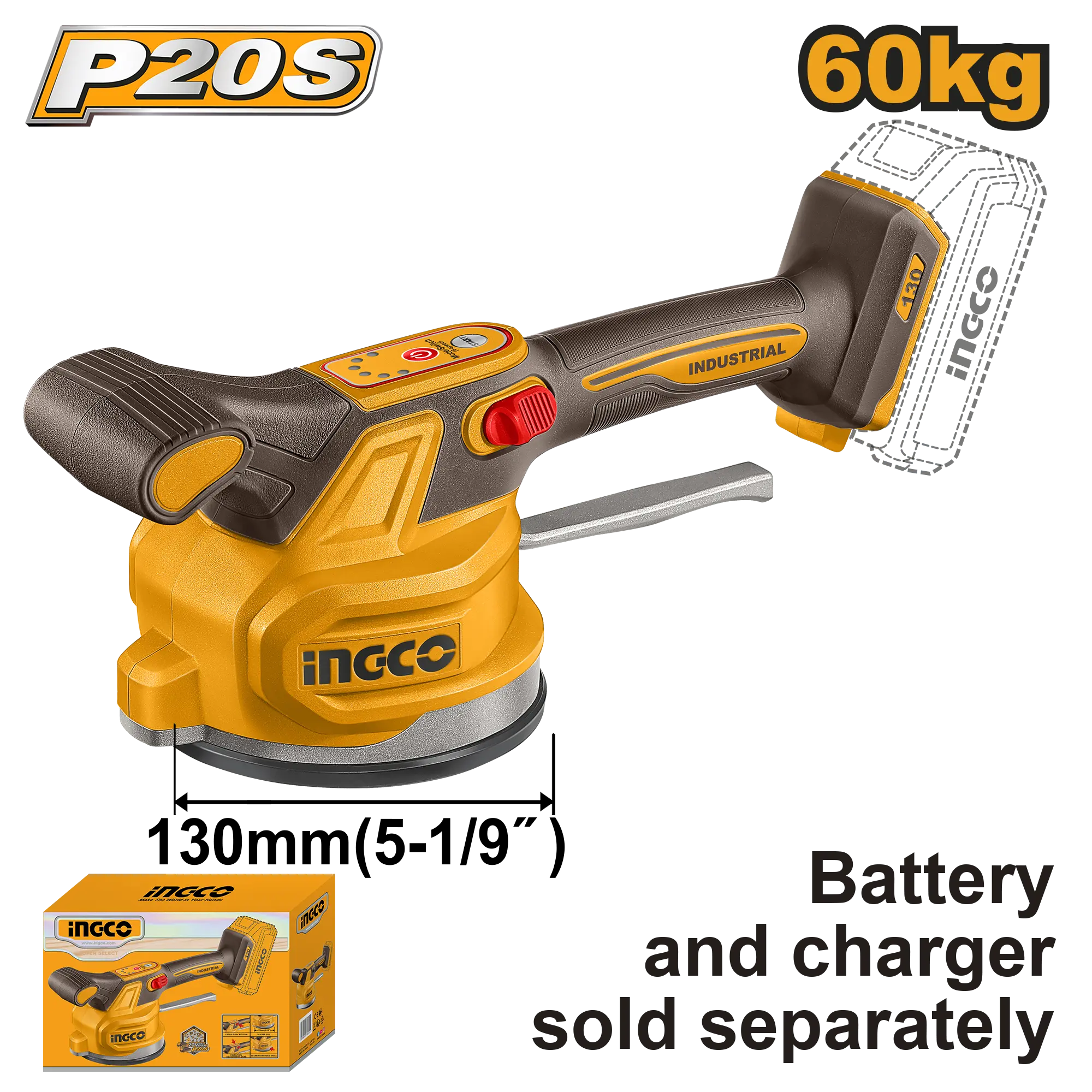 Voltaje: 20 V Frecuencia de vibración: 0-10000 rpm Capacidad de adsorción: 60 kg Diámetro de la ventosa: 130 mm La batería y el cargador se venden por separado. Embalados en caja de color.