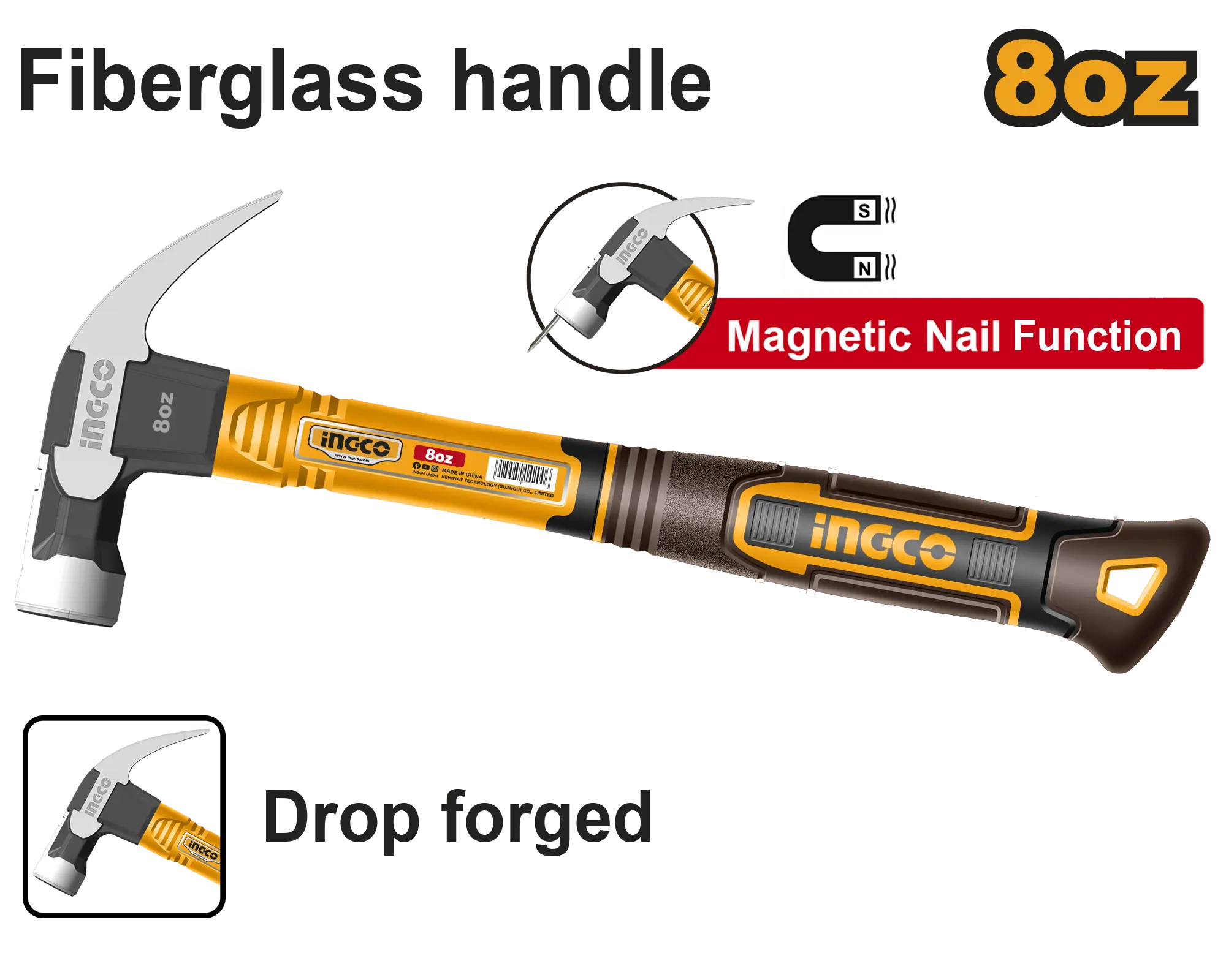 Peso: 8 oz / 220 g Función de clavo magnético Cabeza de martillo forjada innovada Cabeza de martillo forjada Tratamiento térmico, acero al carbono 45# Mango de fibra de vidrio de diseño único Empaquetado por etiqueta