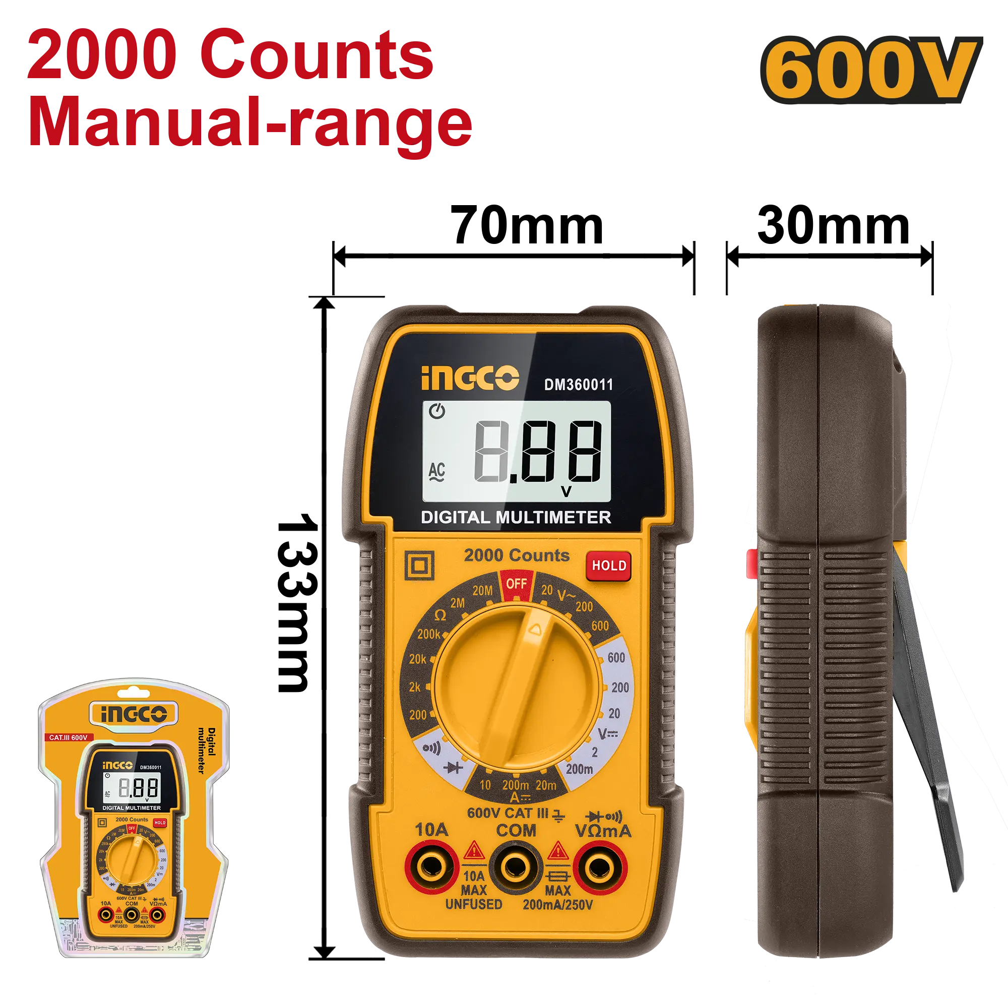 MULTIMETRO DIGITAL 2000 CUENTAS INGCO es un producto dentro de la categoría Herramientas de medición. Marca detectada: Ingco. Producto de ferretería con guía de uso basada en su nombre y medidas. Datos detectados: Largo: 2 m; Voltaje: 2 V.