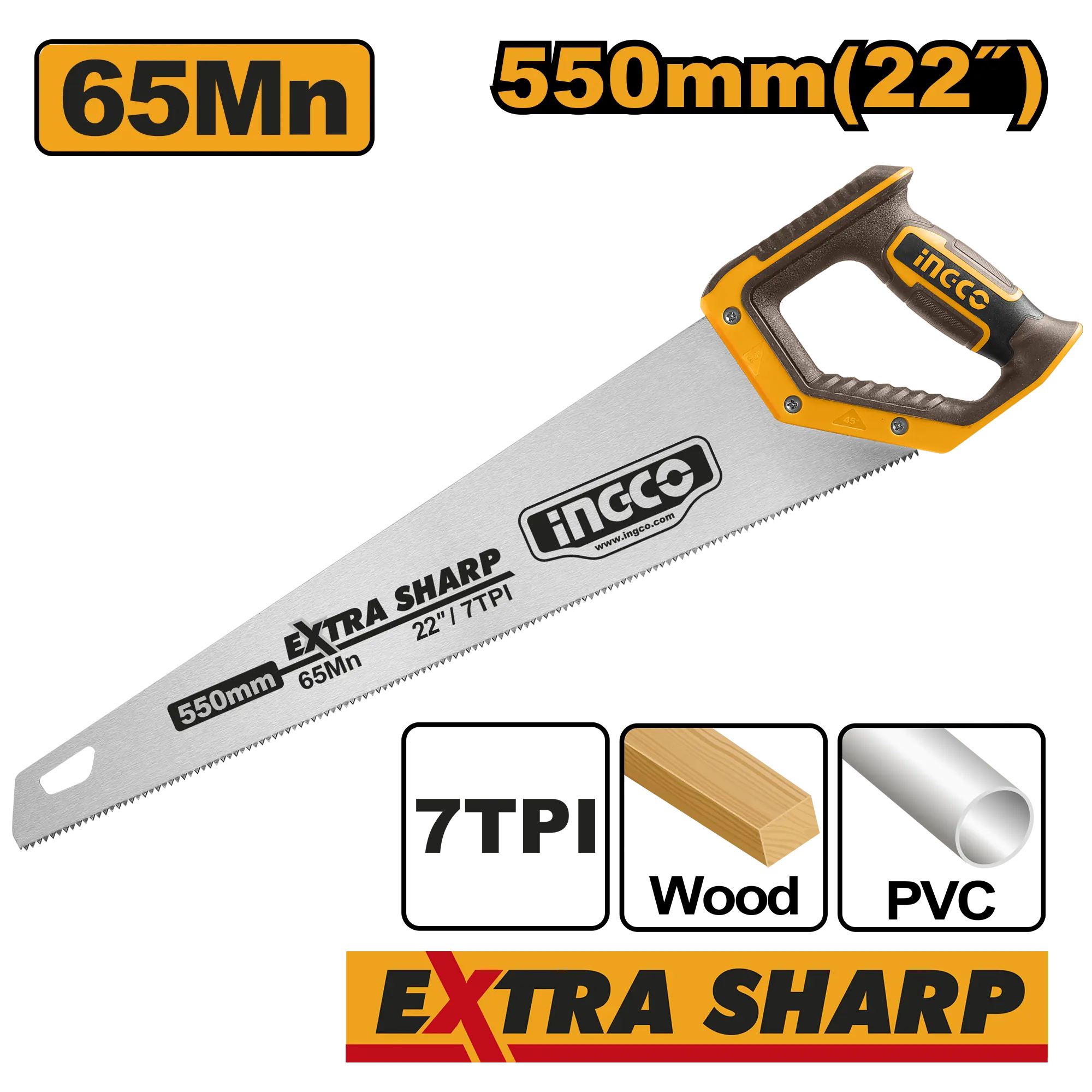 SERRUCHO 550MM INGCO es un producto dentro de la categoría Herramientas manuales. Marca detectada: Ingco. SERRUCHO 550MM INGCO es un herramienta manual orientado a uso práctico y seguro. Datos detectados: Diámetro: 22″; Medida: 550 mm. Nota: Tamaño: 22″ 550 mm nEspesor: 0,9 mm, 7TPI nMaterial: 65Mn nCon protector de dientes nTratamiento térmico nEmbalado en tarjeta de papel nan.
