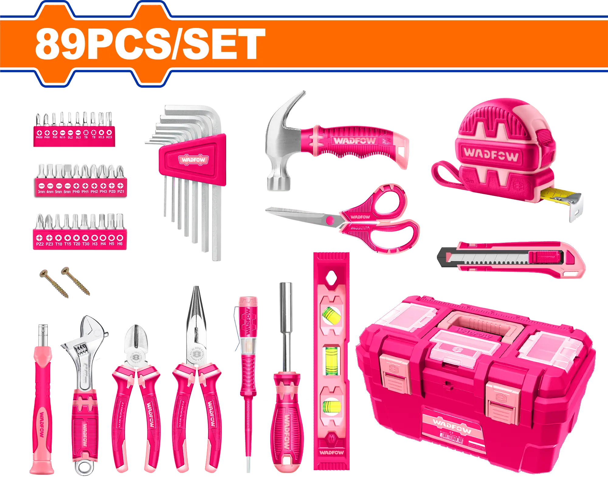 El juego de herramientas manuales de color rosa de 89 piezas incluye: