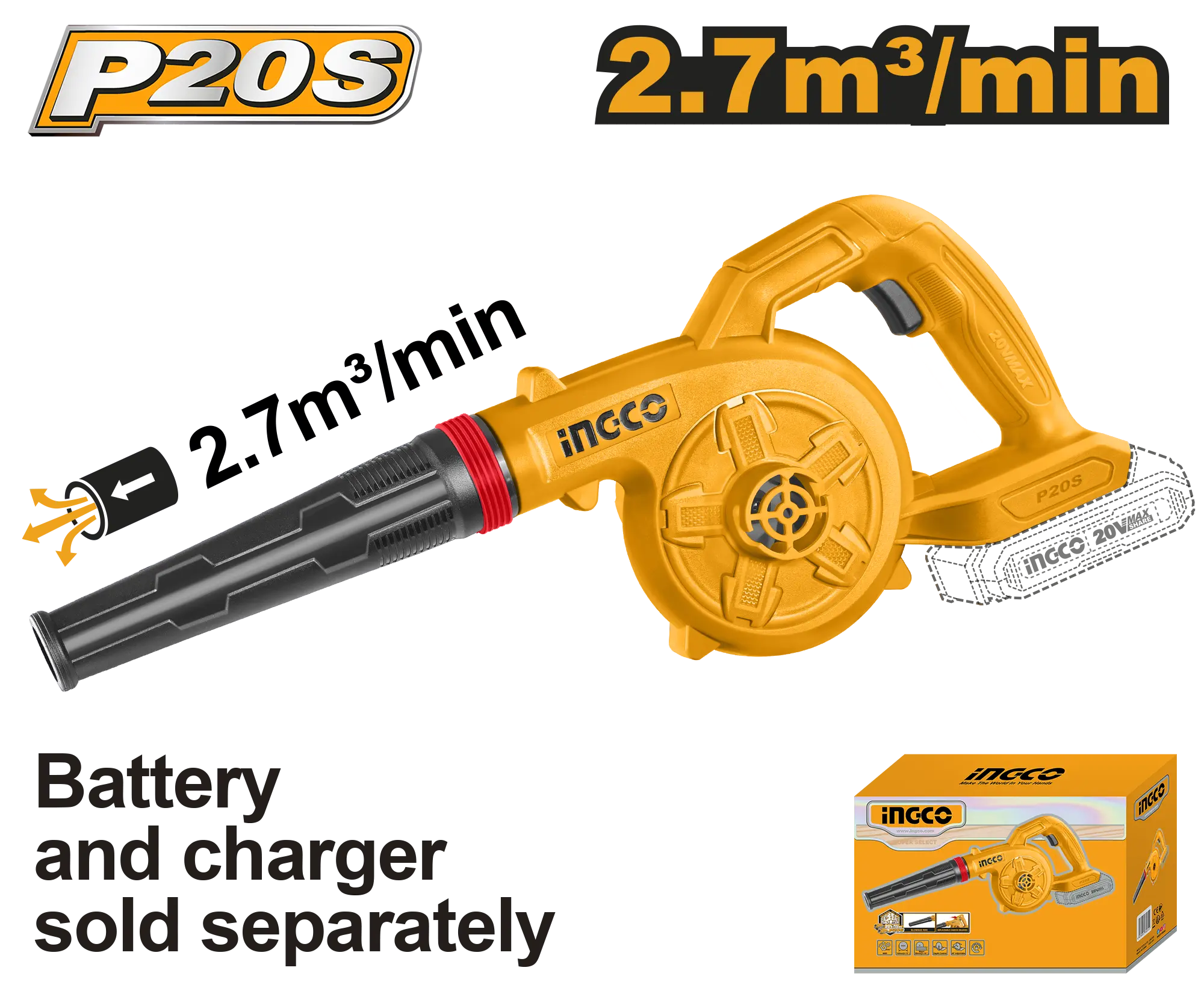 SOPLADOR INALAMBRICO 20V 18000 RPM 2,7M3/MIN INGCO es un producto dentro de la categoría Herramientas inalámbricas. Marca detectada: Ingco. Equipo para generar y almacenar aire comprimido, útil para inflar, soplar y operar herramientas neumáticas ligeras según caudal y presión. Datos detectados: Voltaje: 20 V; Velocidad: 18000 RPM. Nota: Voltaje: 20 V nVelocidad sin carga: 18000 rpm Volumen máximo de aire: 2,7 m³/min La batería y el cargador se venden por separado nEmpaquetado en caja de color.