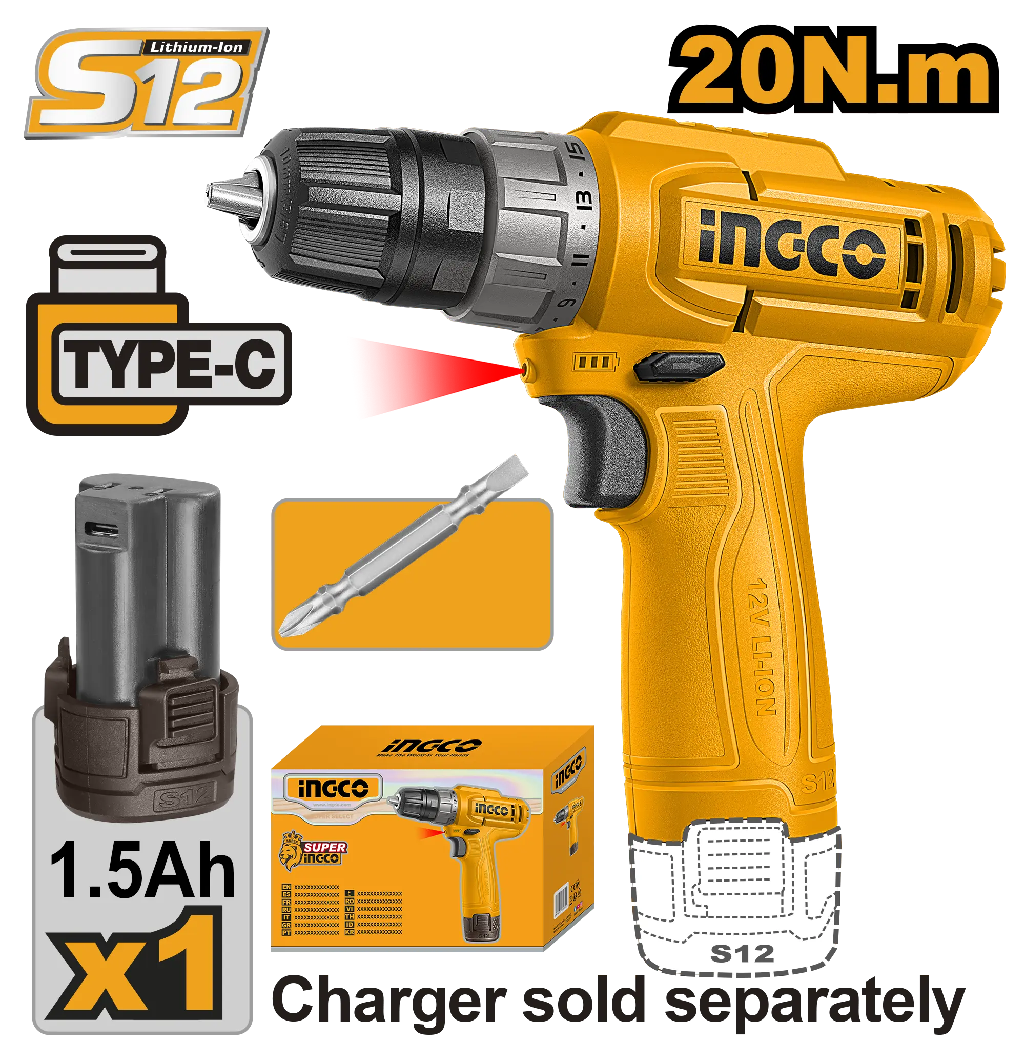 - Producto: TALADRO INALAMBRICO 3/8″ 12V 20N.M + 1 BAT 1.5AH INGCO